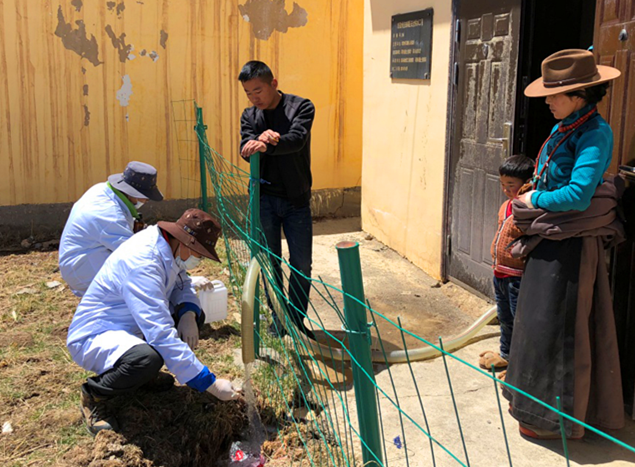 4月18日,項目組人員翻山越嶺,到達了位于海拔4300m的石渠縣城,開展石渠縣地下水監測工作。換上白大褂,戴上口罩和乳膠手套,項目組人員對縣城周邊包蟲病防治地下水取水井進行了全面的檢查和了解,做好相關調查記錄,并對典型井點進行了采樣工作,為石渠縣包蟲病區廣大人民群眾安全飲水保駕護航。