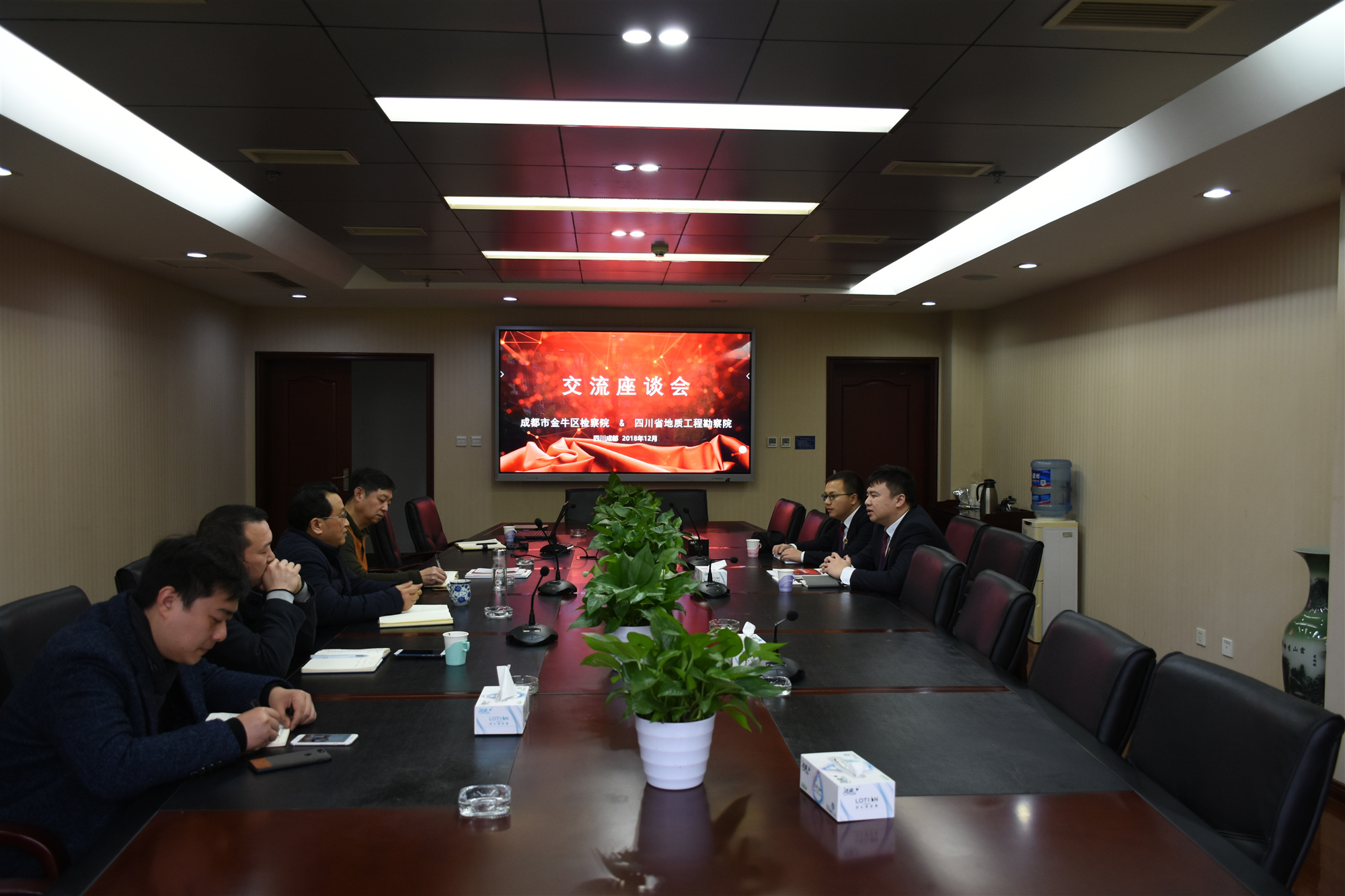 12月7日,成都市金牛區檢察院職務犯罪偵查與預防綜合科科長任立君一行3人到我院交流座談,為我院提供法律咨詢服務,并征求對金牛檢察工作的意見建議。院黨委副書記、紀委書記兼工會主席廖華成、紀檢監察室、地質礦產公司、市場部、綜合管理部等部門負責人參加座談會。