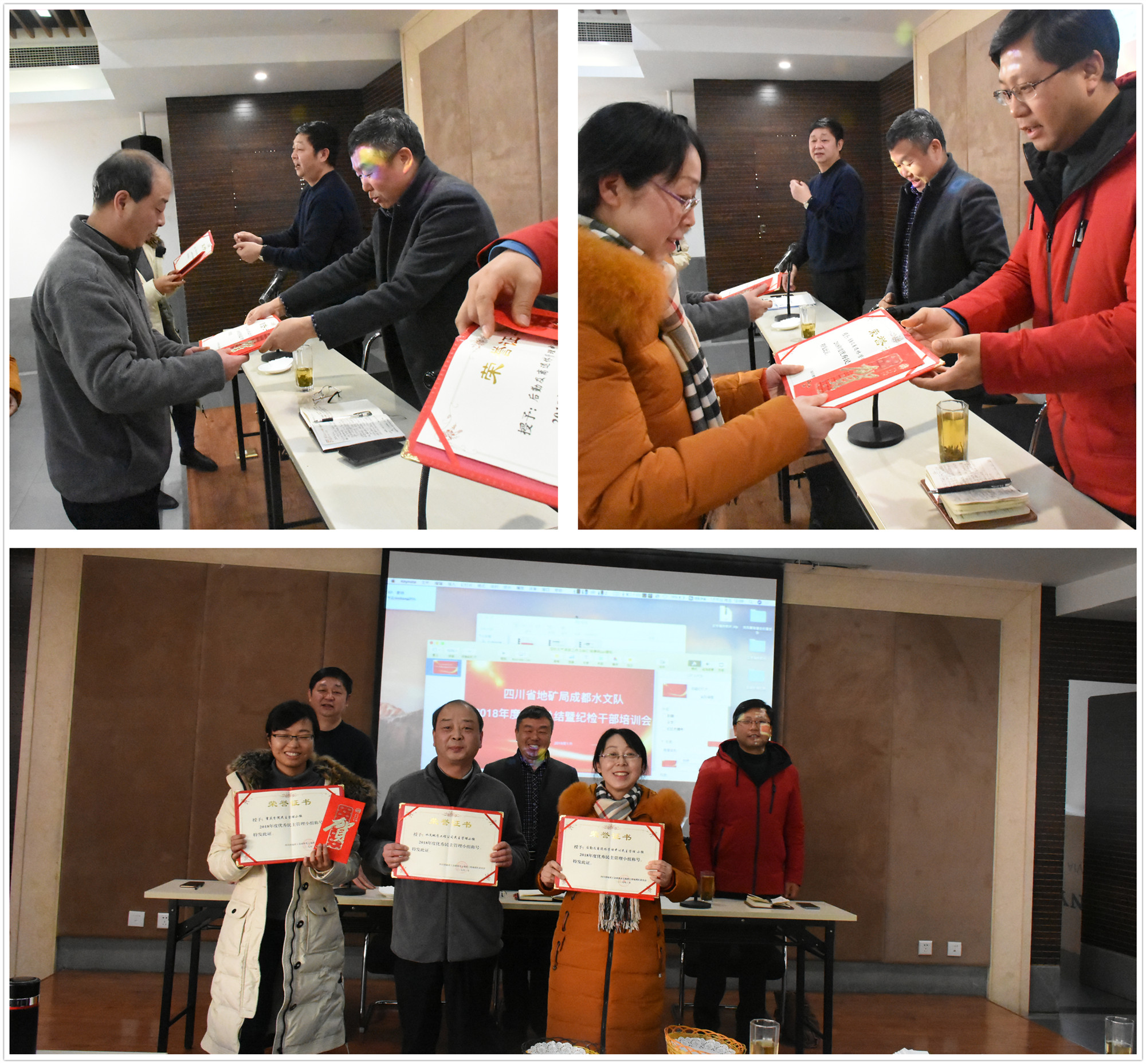 廖華成主席宣讀了2018年度優秀民主管理小組的表彰決定, 其中水文地質工程公司、重慶分院、后勤及離退休管理中心榮獲優秀民主管理小組的榮譽稱號,黨委書記謝大軍、副隊長張宏、工會主席廖華成為獲獎代表頒獎。